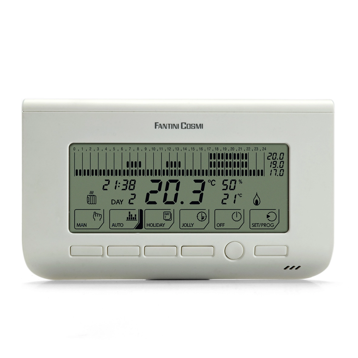 Электронный хронотермостат с микропроце-ссором, с недельным программированием, для управления системами отопления и кондиционирования воздуха. "Радиосистема" создана из одного хронотермостата CH150RF, один исполнитель-ный блок (приемник) для терморегулирования и один исполнительный блок для контроля влажности (не обязательно). Система не предусматривает никакого вида соединения. Сохраняет те же характеристики, как и модель CH150, дополнительно функция регулирования влажности. Широкий дисплей с графическими иконками, которые сочетаются с 6-ю фронтальными кнопками. Профиль дневных действий в зависимости от выбранных температур, визуализированы через гистограмму. Визуализация на дисплее: температура окружающей среды, температура вспомогательного датчика (если установлен), влажность окружающей среды, полученная температура (в зависимости от влажности). Визуализация температуры в градусах по Цельсию или Фаренгейту. Рабочие режимы: АВТОМАТИЧЕСКИЙ, РУЧНОЙ, HOLIDAY, JOLLY, ВЫКЛ. Функция JOLLY для временного отключения программы до 99 часов, получая другую температуру от заданной. Функция COPY (копирование) для копирования программы на следующий день. Функция DAY (день), чтобы перейти на следующий день без копирования программы. Настройка: стандартная (ВКЛ.-ВЫКЛ.) или пропорциональная. Термический дифференциал: высокий (HI) и низкий (LO). Радиус действия сигнала 30 метров. CH150RF может управлять одновременно несколько исполнительных блоков CH170D. Соответствует стандартам EN 60730-2-9; EN 60730-2-11.